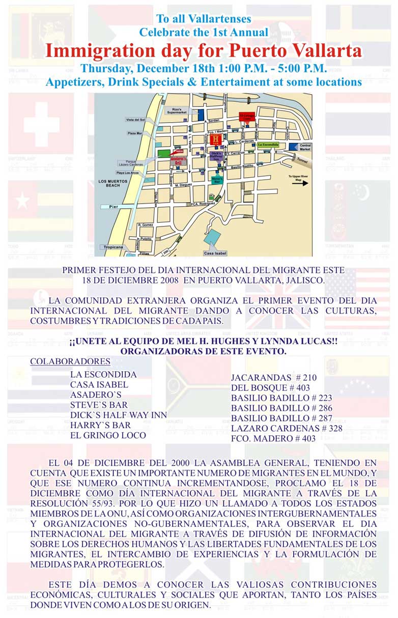 Immigration Day Celebrations Get to know the costumes culture and traditions of expats living in Puerto Vallarta by going to one of the following bars. I assume that this is somewhat of a joke, but it’s an admirable joke: